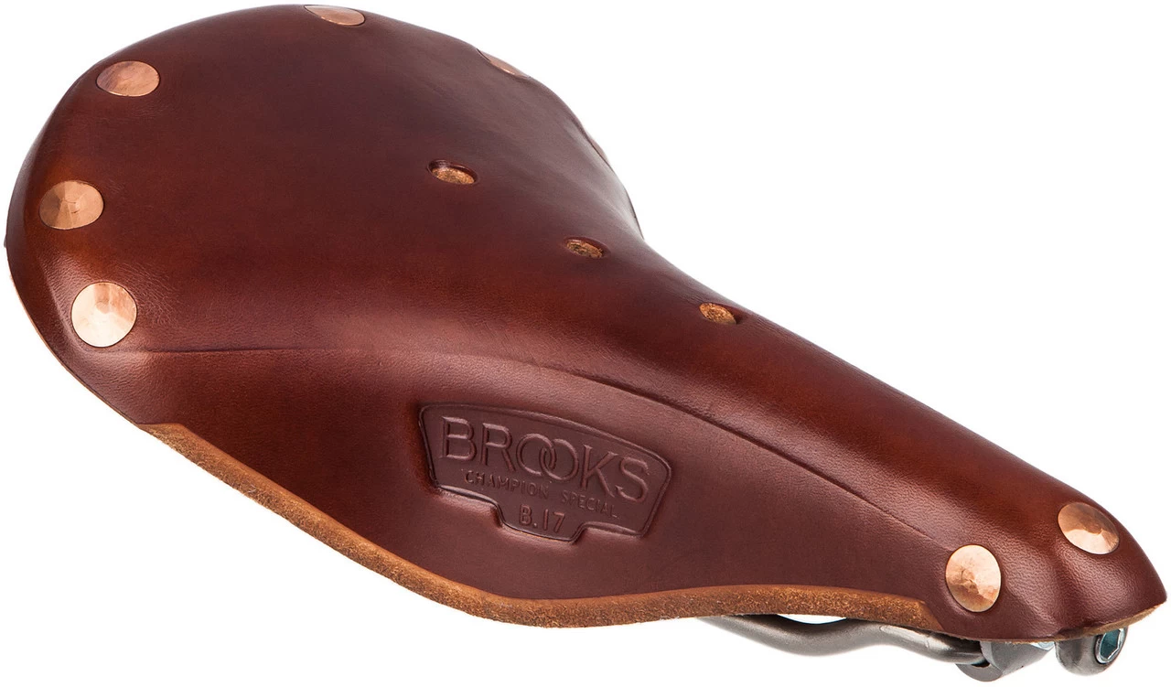 Der B17 Titanium besitzt einen Premium Titan-Rahmen um Gewicht zu sparen und den Komfort zu verbessern. Er ist ideal für lange Strecken oder sportliche Touren, für Trekking- und ATB-Fahrräder. Vor über 100 Jahren kam von Brooks zum ersten Mal ein Sattel dieser Bauart auf den Markt. Erste Erwähnung fand er in einem Katalog von 1898. Dieser Sattel kann sowohl von Männern als auch von Frauen gefahren werden. Jeder Sattel ist ein Unikat mit von Hand eingeschlagenen Kupfernieten.