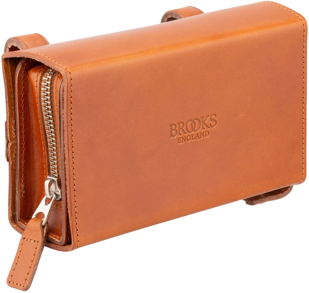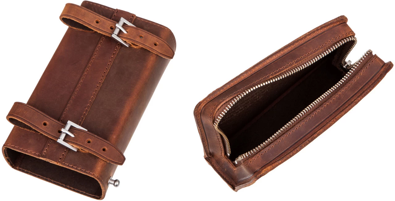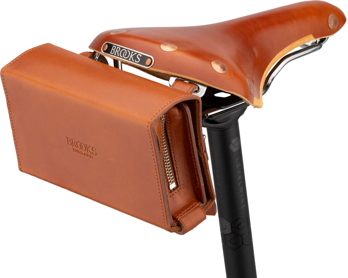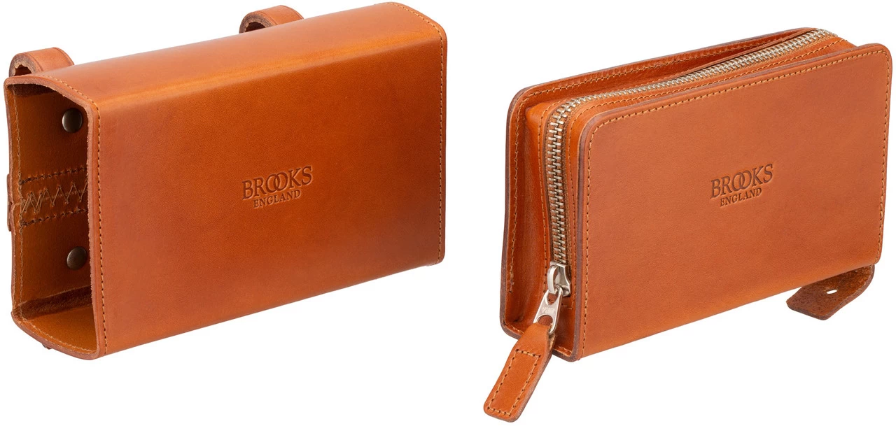 Die D-Shaped Satteltasche tauchte schon im Jahr 1910 in Brooks Katalogen auf. Das innovative Design besteht aus zwei Elementen. Die Außentasche kann am Rad montiert bleiben, während man die innere Tasche im Portemonnaie-Style herausnehmen kann.