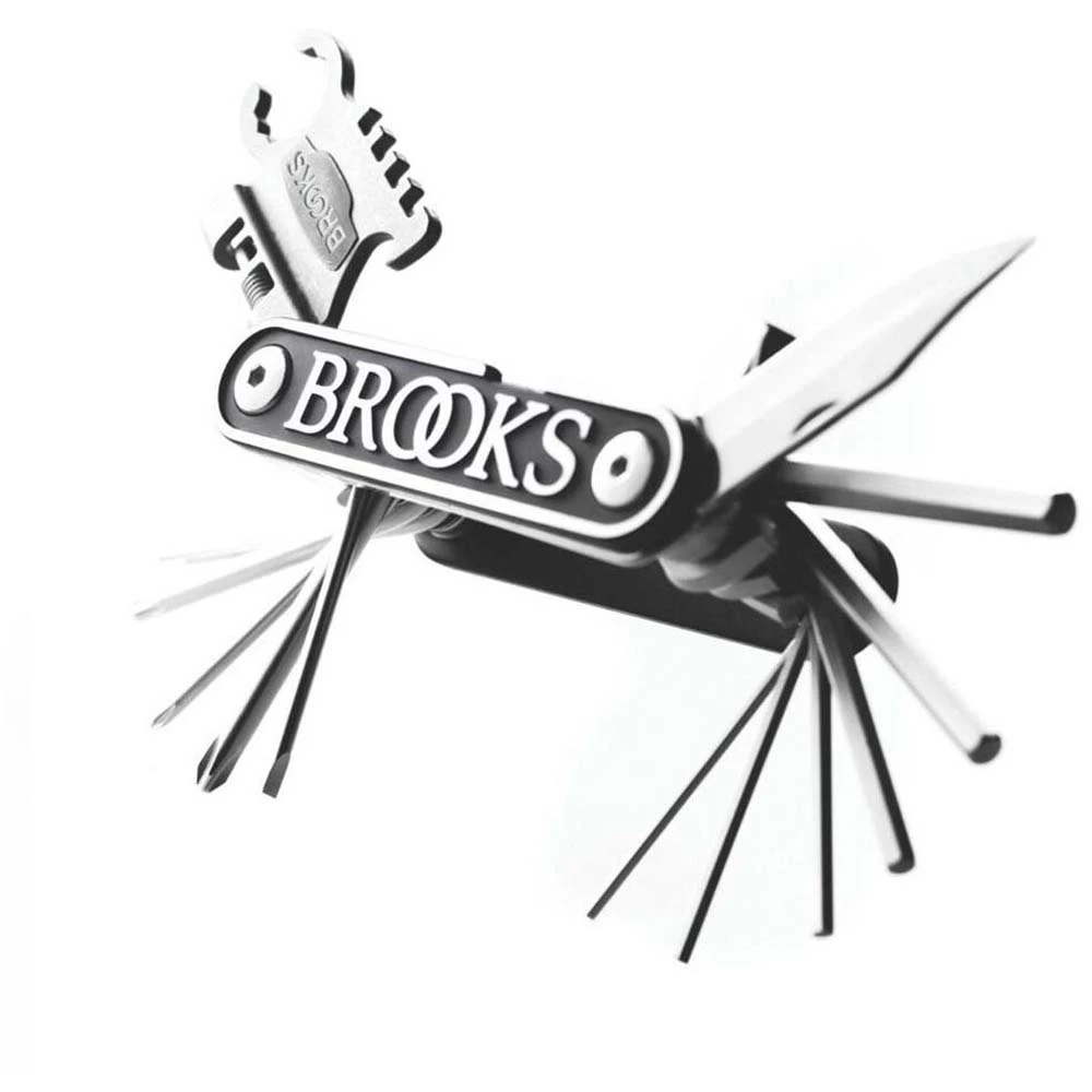 7 Inbusschlüssel / Sechskantschlüssel: #2, 2.5, 3, 4, 5, 6, 8 3 Schraubendreher: Kleiner Flachkopfschraubendreher, Kreuzschlitzschraubendreher #2 (mittlerer Kopf), Kreuzschlitzschraubendreher, #1 (kleiner Kopf) 3 Torx-Schraubendreher : T10, T20, T25 4-Speichen-Schlüssel: #0, 1, 2, 3 Kettenwerkzeug Flaschenöffner für Brooks Sattelmesser