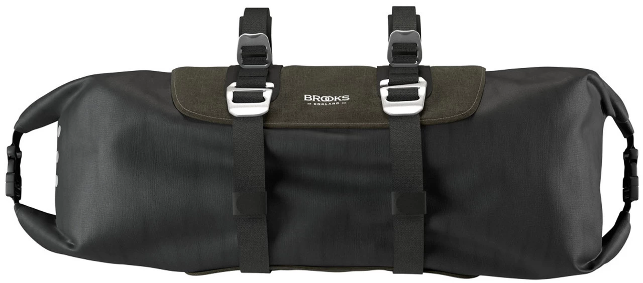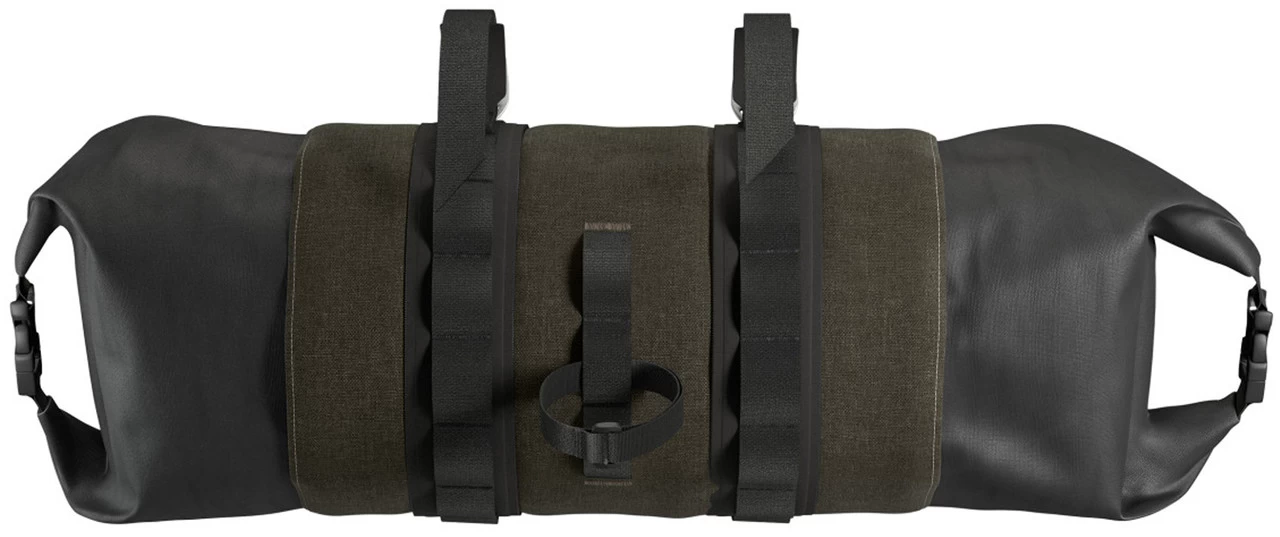 Die Scape Handlebar Roll von Brooks ist eine Bikepacking-Lenkertasche, die Du von beiden Seiten befüllen kannst. Außerdem besteht sie aus einem Holster und einer Dry Bag. Dadurch kannst Du das Holster am Bike lassen und nur die Dry Bag entfernen.